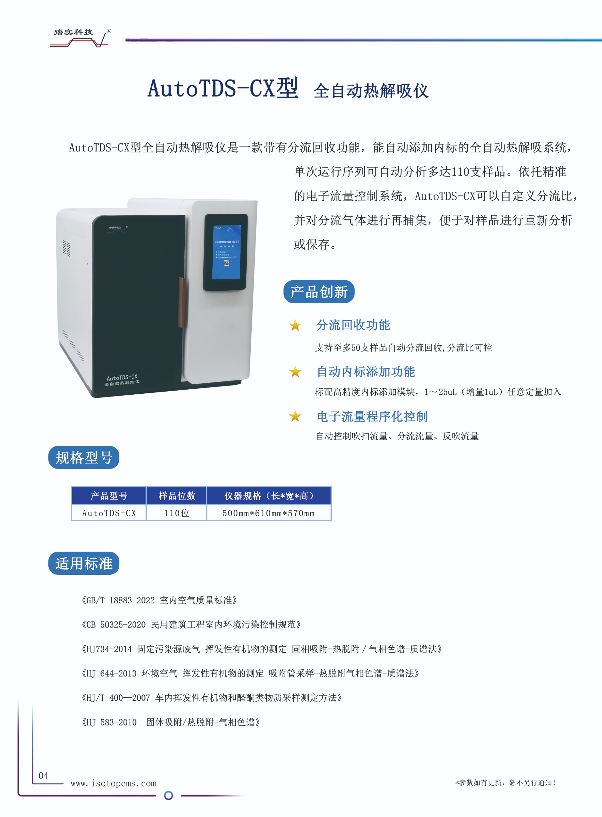AutoTDS-CX型全自動(dòng)熱解吸儀是一款帶有分流回收功能,能自動(dòng)添加內(nèi)標(biāo)的全自動(dòng)熱解吸儀,單次運(yùn)行序列可自動(dòng)分析多達(dá)110支樣品。依托精準(zhǔn)的電子流量控制系統(tǒng),AutoTDS-CX可以自定義分流比,并對(duì)分流氣體進(jìn)行再捕集,便于對(duì)樣品進(jìn)行重新分析或保存。